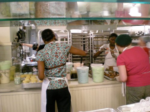 Il était impossible pour moi de ne pas m’arrêter dans cette si connue et réputée pâtisserie de New York. J’ai cédé à l’appel des sirènes et me suis arrêtée chez Magnolia Bakery au détour d’une balade pluvieuse. Par chance, je n’ai pas eu à faire la queue, et me suis engouffrée très vite à l’abri, aspirée par l’odeur envoutante des gâteaux tout chaud sortant du four. J’ai pris le temps de regarder les petites mains qui œuvraient, glaçant des centaines de cupcakes avec une aisance impressionnante.
