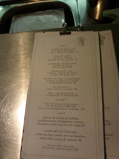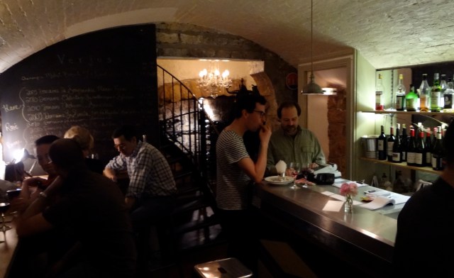 3 à 4 semaines d’attente avant d’avoir une table pour le dîner, nous nous réfugions donc au bar à vin, situé au sous sol.