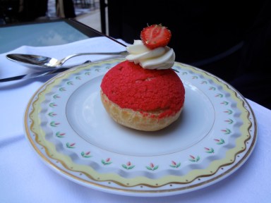 Déborah et moi décidons de nous partager une part de cake au chocolat et un « finger » à base d’amande amer, d’abricot et de chocolat. Sophie choisit le chou à la rose et à la fraise.