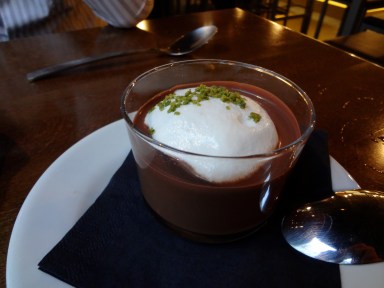 En dessert, nous partageons une soupe chocolat framboise mascarpone : dessert assez voluptueux, au goût intense de chocolat, mais rien non plus de mémorable.
