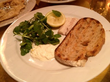 Séduite par le lieu d’abord, même si le temps automnal ne nous a pas permis de dîner en terrasse. Installé sur les docks de Portobello, le restaurant, rénové par le designer Tom Dixon, est un ancien un hangar : terrasse spacieuse, salle en pierres, cuisine ouverte et tables en cuivre d’inspiration orientale. L’atmosphère est chaleureuse, on se sent immédiatement bien.