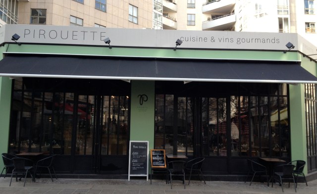 C’est ainsi que par une froide journée de février, V et moi avons apprécié l’accueil chaleureux de Pirouette. Certes, le quartier ne fait pas rêver et l’immeuble année 60 planqué derrière le restaurant gâche un peu le paysage. Mais à l’intérieur, c’est une autre ambiance : la salle boisée haut de plafond est chaleureuse et extrêmement lumineuse grâce à son immense verrière. En outre, situé juste en face d’une petite place piétonne, il est fort à parier que la terrasse devienne l’une des plus courues de cet été.